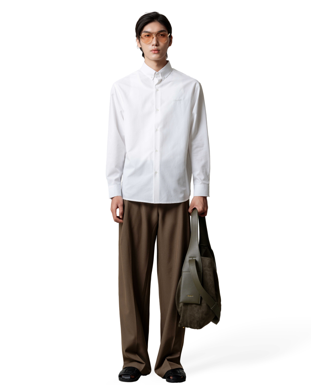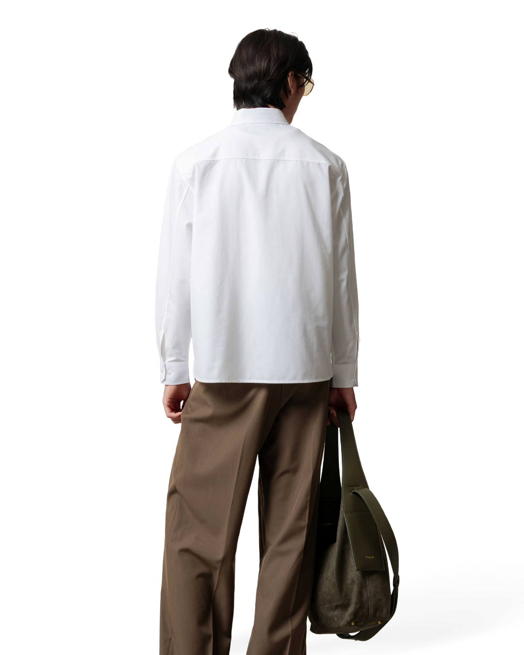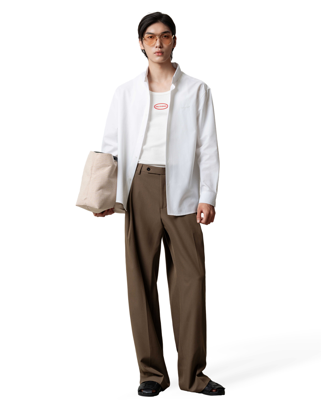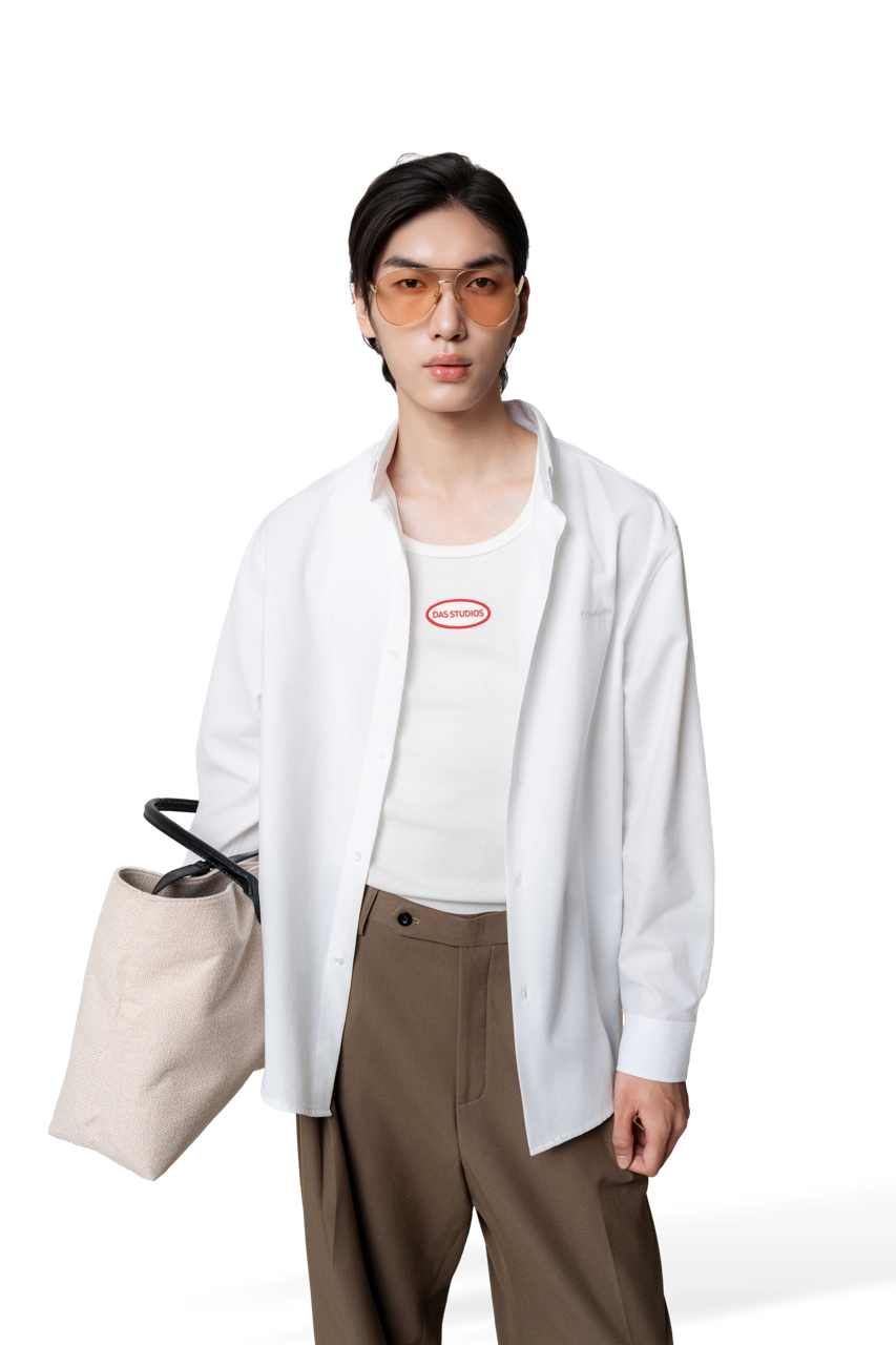 Áo sơmi oversize tay dài hoạ tiết chữ thêu cùng màu trên ngực trái.