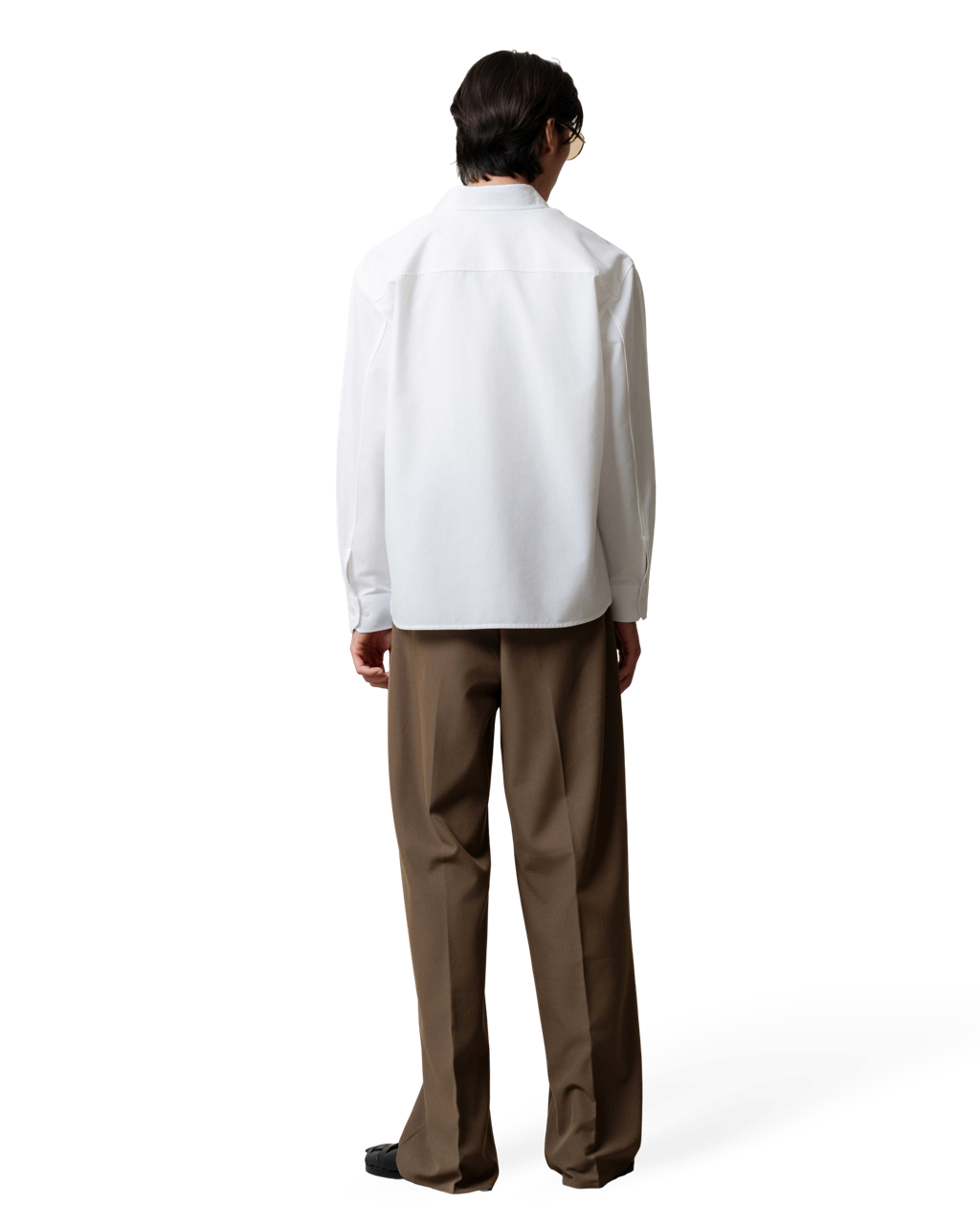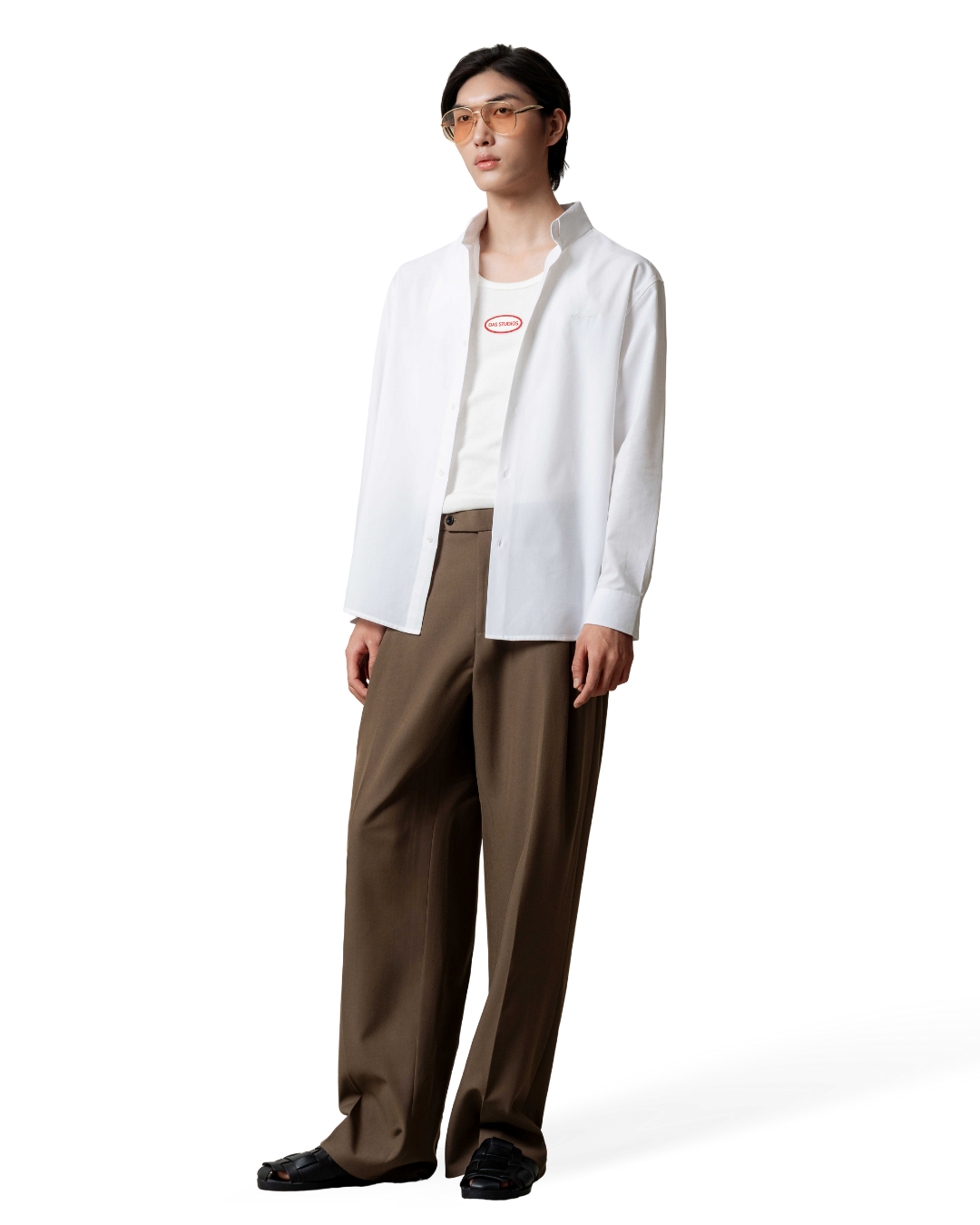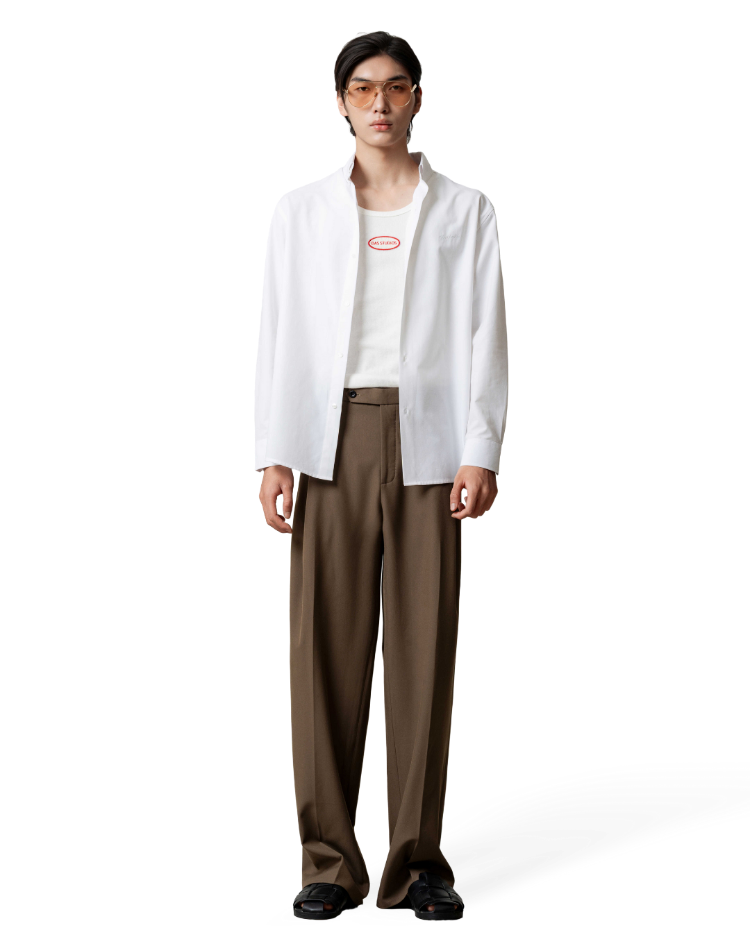 Áo sơmi oversize tay dài hoạ tiết chữ thêu cùng màu trên ngực trái.