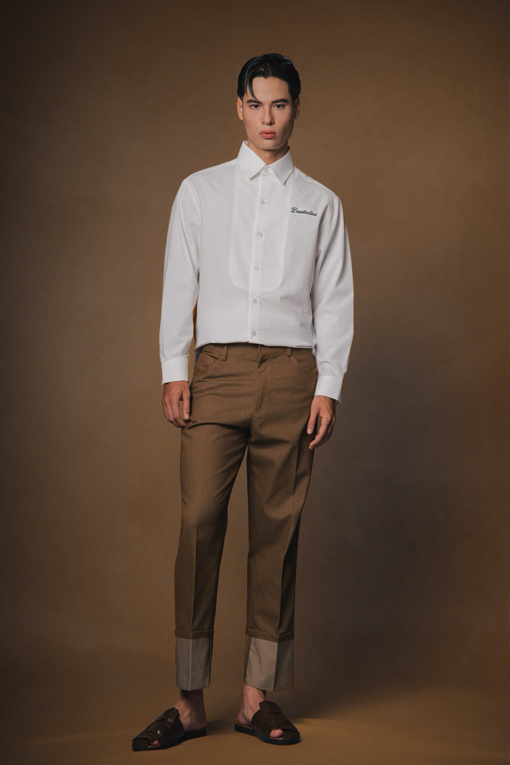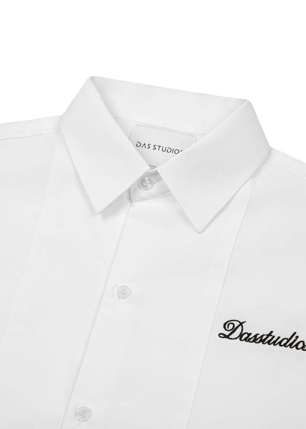 Áo sơm tay dài phối hoạ tiết yếm đắp trước ngực, chi tiết thêu chữ trên ngực trái dòng chữ "Dasstudios"