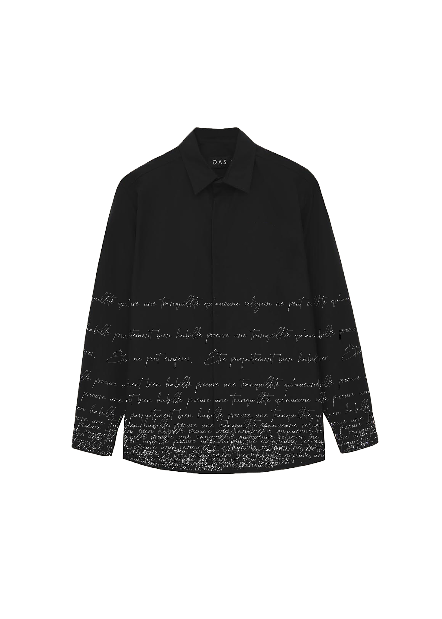 Áo sơ mi tay dài phối chữ dầy từ tà áo thưa dần lên