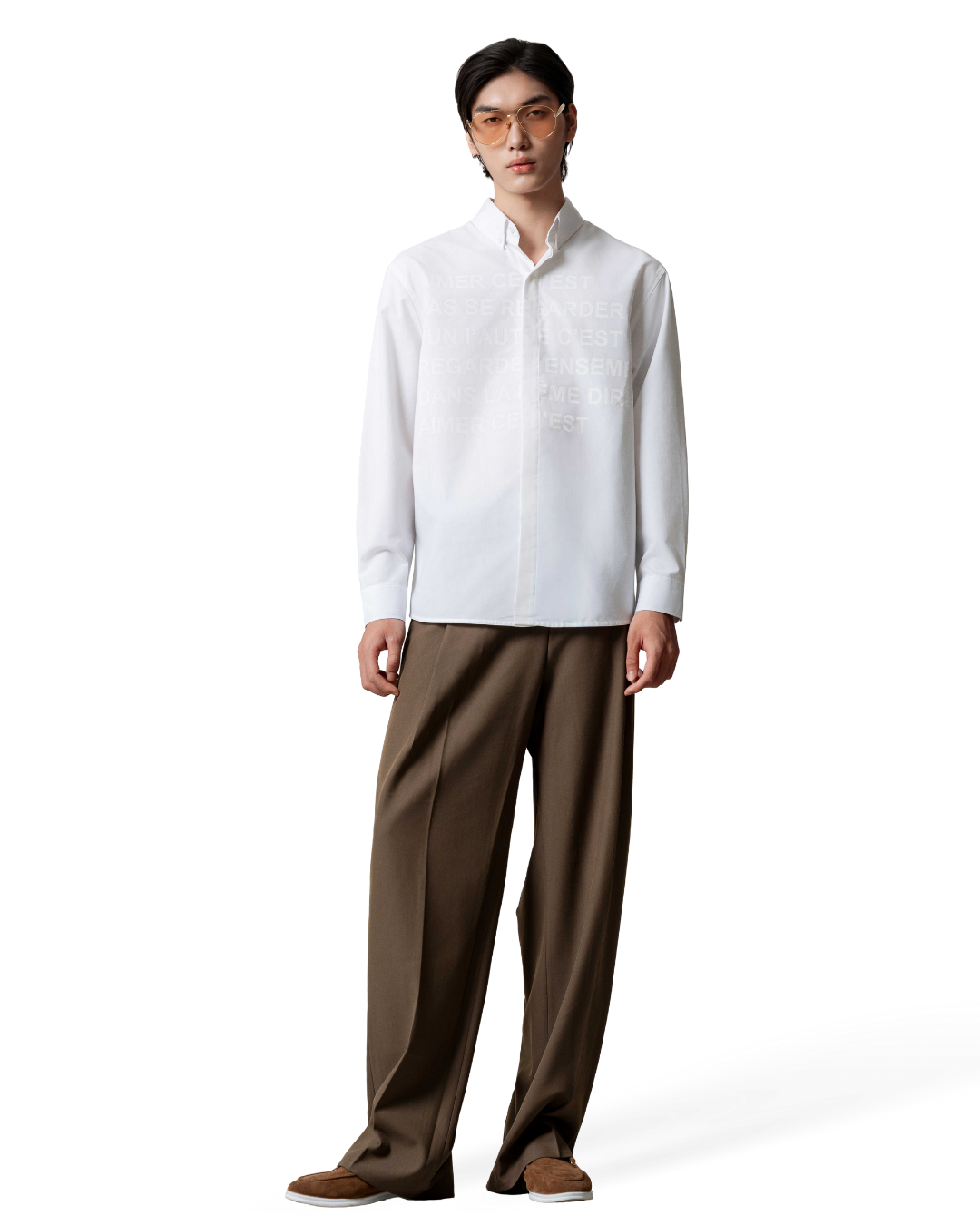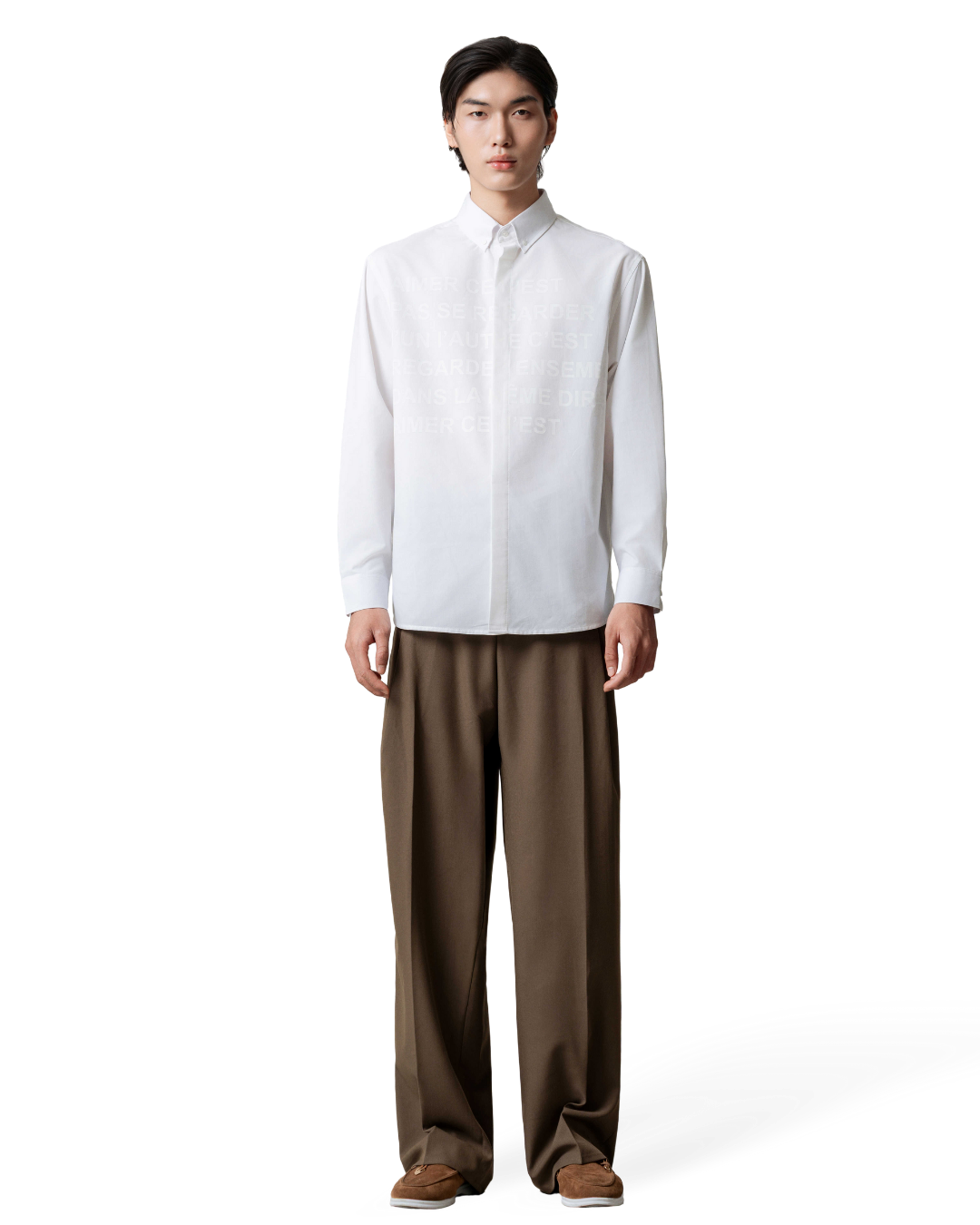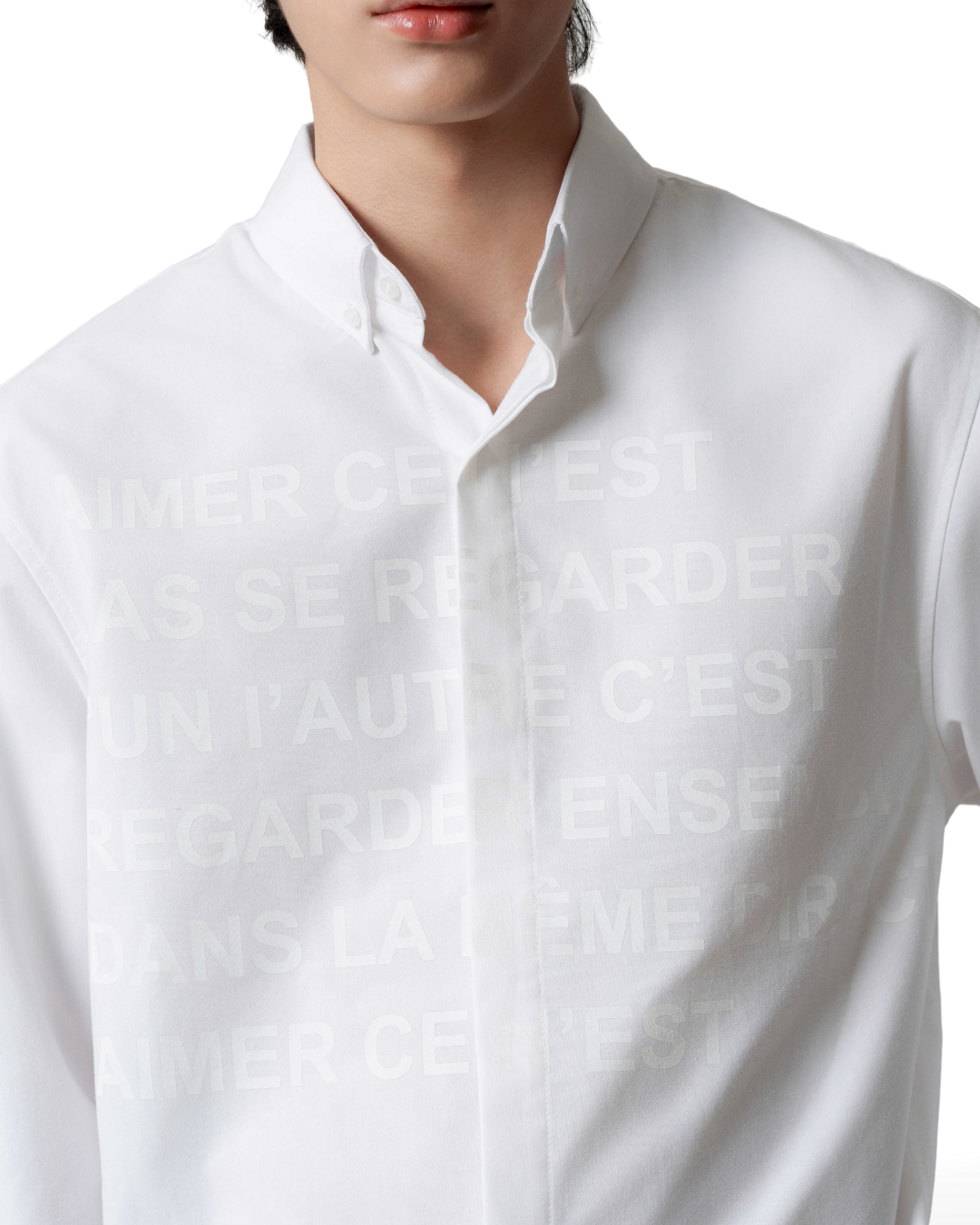 Áo sơmi oversize tay dài màu trắng kem cùng hoạ tiết chữ in mặt trước áo.