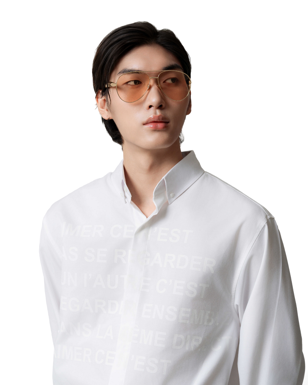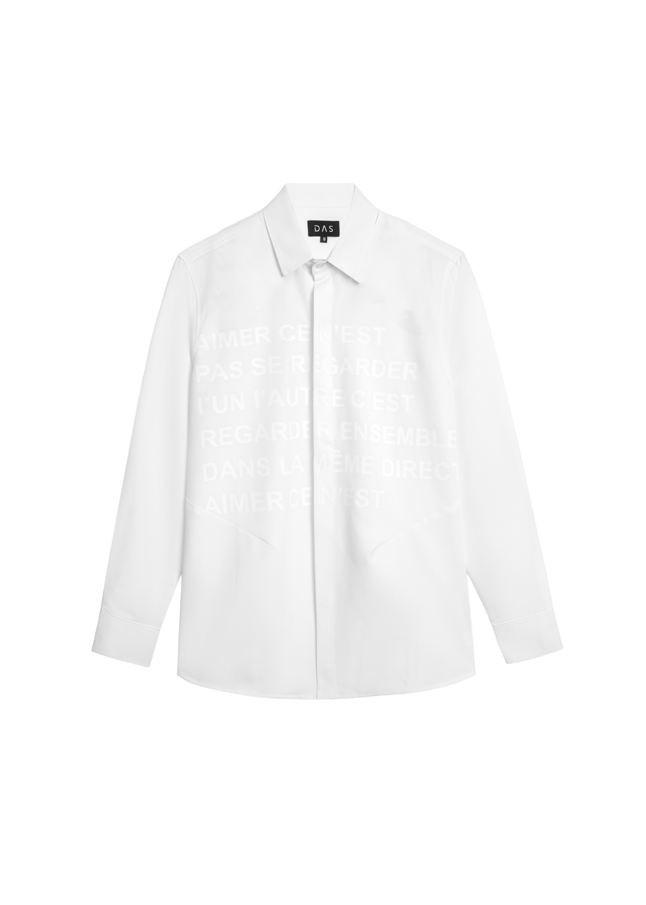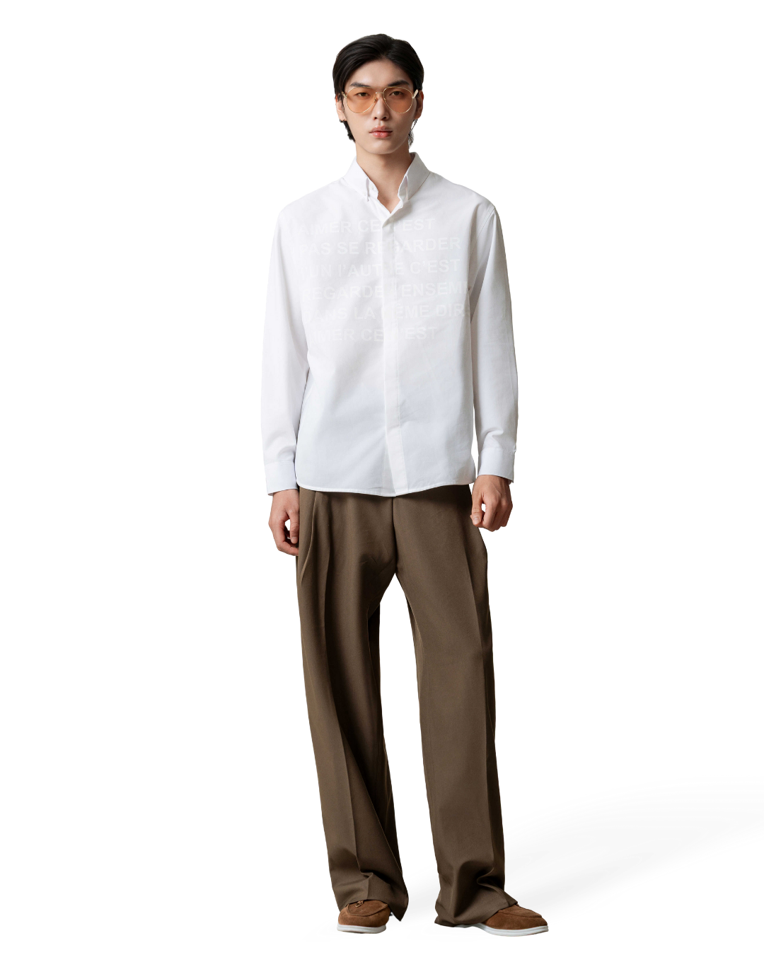 Áo sơmi oversize tay dài màu trắng kem cùng hoạ tiết chữ in mặt trước áo.