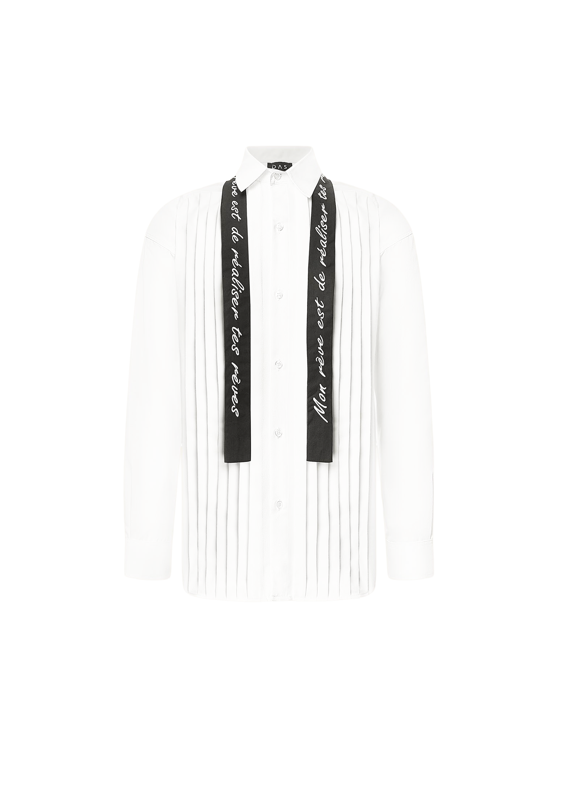 Áo sơ mi tay dài có phối xếp li hai bên áo trước ngực xuống tà,có tặng kèm dây nơ