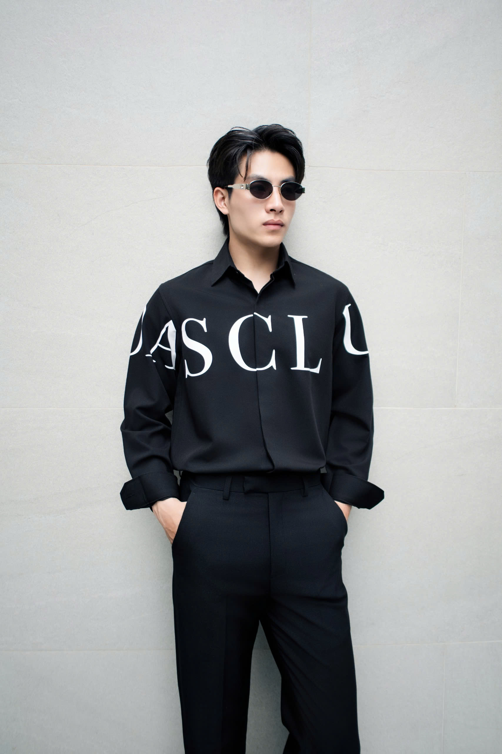 Áo sơ mi tay dài phối chữ trắng phối từ tay trái vòng qua tay phải