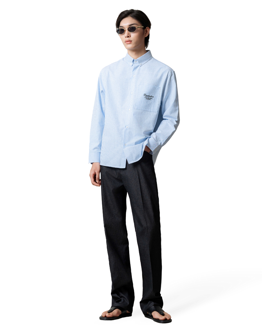 Áo sơmi oversize tay dài cùng hoạ tiết chữ thêu trên túi áo.